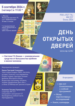 Вот и кончилось лето! Пора задуматься об учёбе! Всем, кто хотел бы разобраться в человеке, самом себе, своих близких, человеке как явлении, человечестве в целом, надо подумать о вступлении в МК ССГ. Решиться на этот шаг, наверное, не легко, кругом столько раскрученных брендов... Увы, в гуманитарной сфере с образованием всё очень и очень плохо. Никакой психологии и философии как науки не получилось. Наука только у нас! Хотите узнать подробности о процессе обучения, приходите. День открытых дверей! Будем знакомиться! Встречу проводят Татьяна Усиленок и Григорий Кваша. Ответим на любые ваши вопросы. Ждём вас в четверг, 5 сентября в 19.00 по адресу: Москва, Ленинский пр. д.19, стр 1. Предварительная запись обязательна. Пишите по адресу: mkssg@mail.ru с пометкой "День открытых дверей" | | Кваша Г. С. · Новости МК ССГ · 31-08-2024 |  |