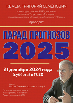 Главное событие года для нашей системы! Встреча всех друзей и соратников! И конечно "Волшебный календарь - 2025" с автографом автора. "Парад прогнозов" состоится в субботу, 21 декабря в Энергетическом институте (Ленинский проспект, дом 19, строение 1) в 17.30. В программе отчет по прежним прогнозам, политический прогноз на год (2025) и четырехлетие (2025-2029), прогноз по странам, прогноз по известным политическим и медийным лицам. И конечно же, прогноз по знакам, который будет полностью озвучен впервые именно на "Параде прогнозов". Само собой, Г.С. ответит на все Ваши общие, а может быть и некоторые частные вопросы. Подпишет книги и календари. Новогоднее настроение гарантируется! Ждём Вас! Регистрация обязательна. Пишите на адрес: mkssg@mail.ru с пометкой "Парад прогнозов". | | Кваша Г. С. · Новости МК ССГ · 09-12-2024 |  |